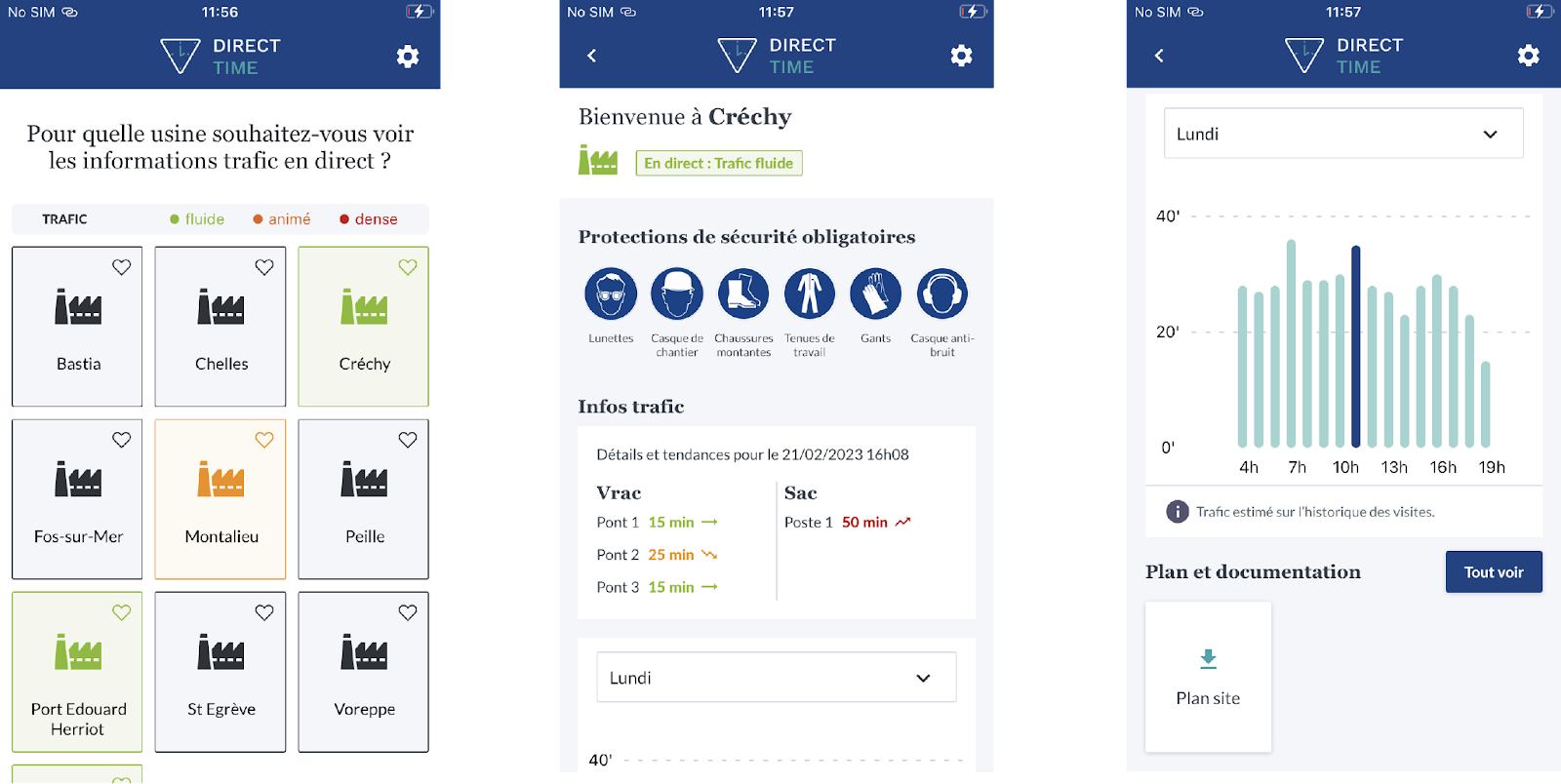 Direct Time : une solution web et mobile pour fluidifier et optimiser le passage des camions en usine. Cette application à destination des conducteurs et exploitants transports leur permet de se renseigner en temps réel sur l’état d’attente des différents quais de chargement, les actualités du site et les différents documents de ces sites. Direct Time c’est 3 interfaces : un site web pour les exploitants des sociétés de transport, une application mobile pour les conducteurs et un back office.
